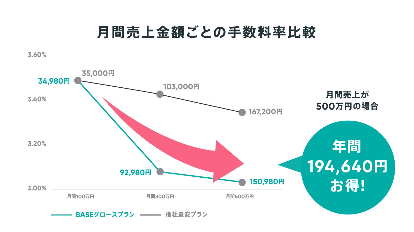 既に「BASE」をご利用のネットショップの場合は、ショップの売上規模が月商17万円を超えると従来の料金プランよりも手数料を抑えられるため、その分の費用を商品の開発や販促、仕入れなどに還元いただくことで、ショップのさらなる成長が見込めます。