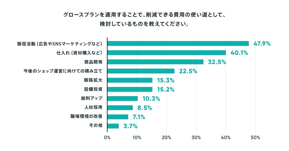 「グロースプランを適用することで、削減できる費用の使い道として、検討しているものを教えてください。」という設問では、「販促活動(広告やSNSマーケティングなど)」が最も多く選択され、次いで「仕入れ(資材購入など)」、「商品の開発」が続きました。ネットショップでの売上を向上させる取り組みの1つとして販促活動が挙げられますが、近年ブランドの認知や顧客の獲得にSNSを活用する事例が増えており、本調査でも削減できる費用の使い道として販促活動を選択したショップが多い結果となりました。