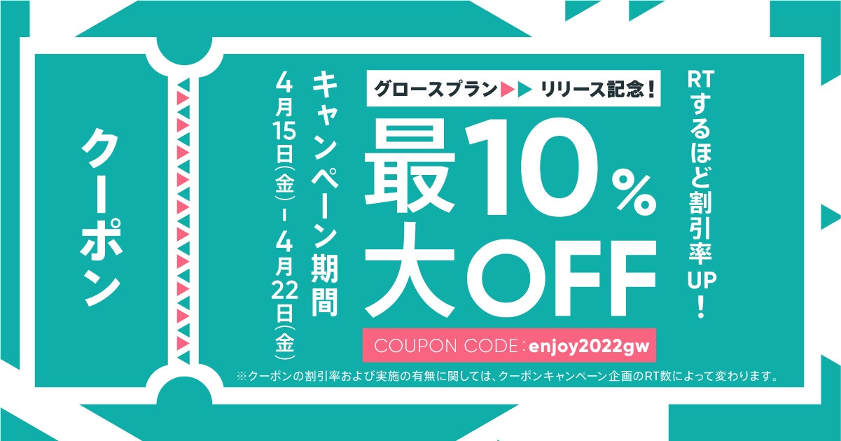また、グロースプランのリリースに合わせて、「BASE」のショップオーナーを対象としたグロースプランに関する利用意向調査を実施したほか、Twitter上でのリツイート数で割引率が変動する「グロースプランリリース記念! BASE Spring 最大10%OFF クーポン」キャンペーンも実施しておりますのでお知らせいたします。