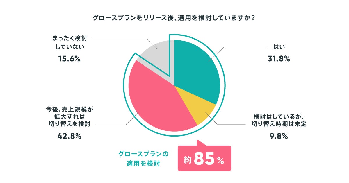 「グロースプランをリリース後、適用を検討していますか?」という設問では、「はい」が31.8%、「検討はしているが、切り替え時期は未定」が9.8%、「今後、売上規模が拡大すれば切り替えを検討」が42.8%、「まったく検討していない」が15.6%となりました。今後の売上規模も踏まえて適用を検討したいネットショップは84.4%にのぼることがわかり、グロースプランの利用意向の高さが明らかになりました。