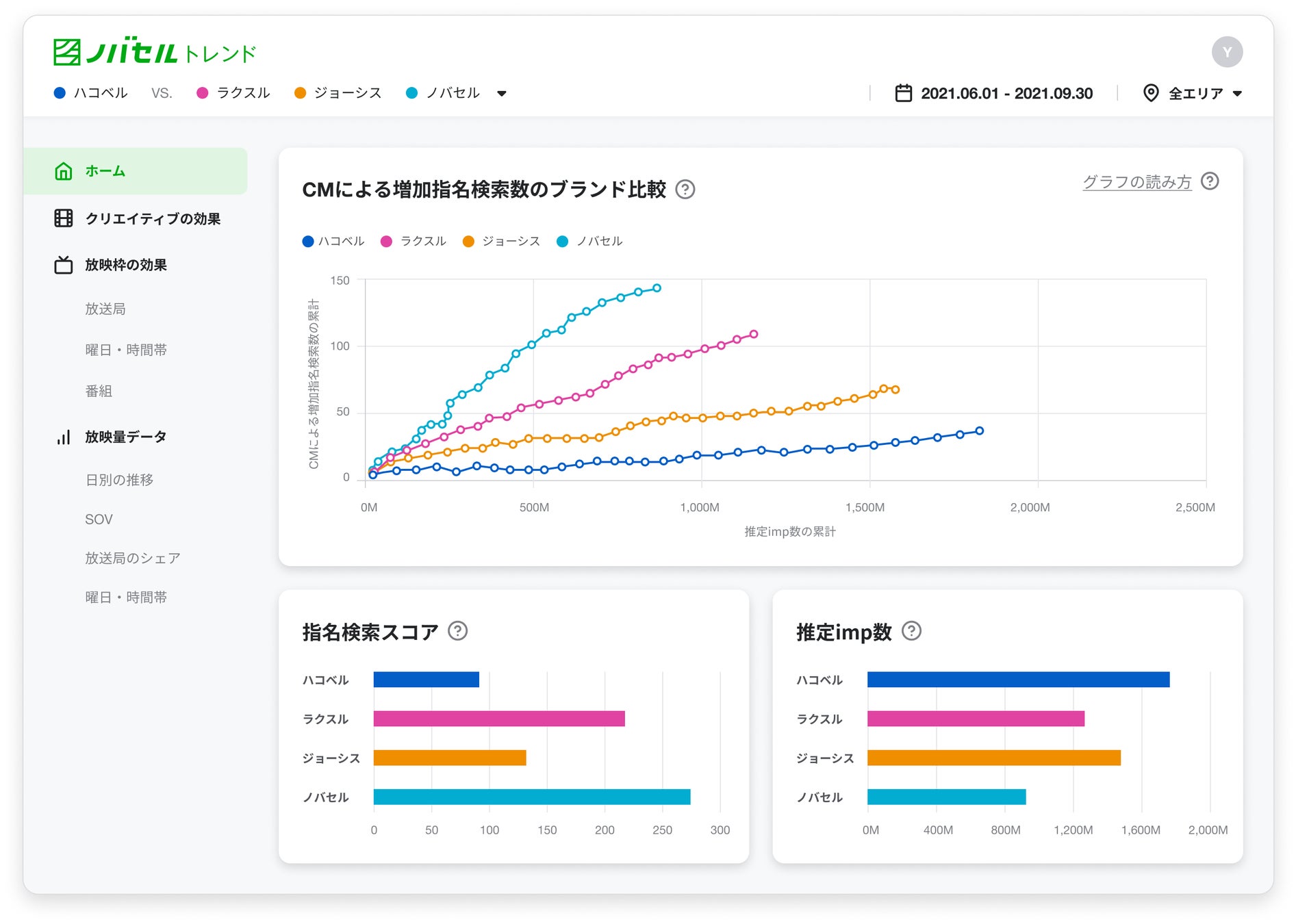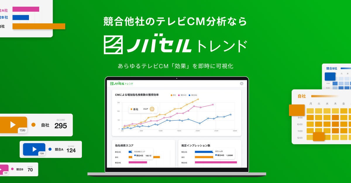 今回リリースする「ノバセルトレンド」は、これまでノバセルがSaaSプロダクトとして提供してきたクラウド型テレビCM運用ツール「ノバセルアナリティクス」の派生サービスです。自社のCM効果だけではなく、競合他社のCM効果が簡単に情報取得できるツールで、競合他社のテレビCM「効果」データから、誰でも簡単に業界の勝ちパターンを把握することが可能です。