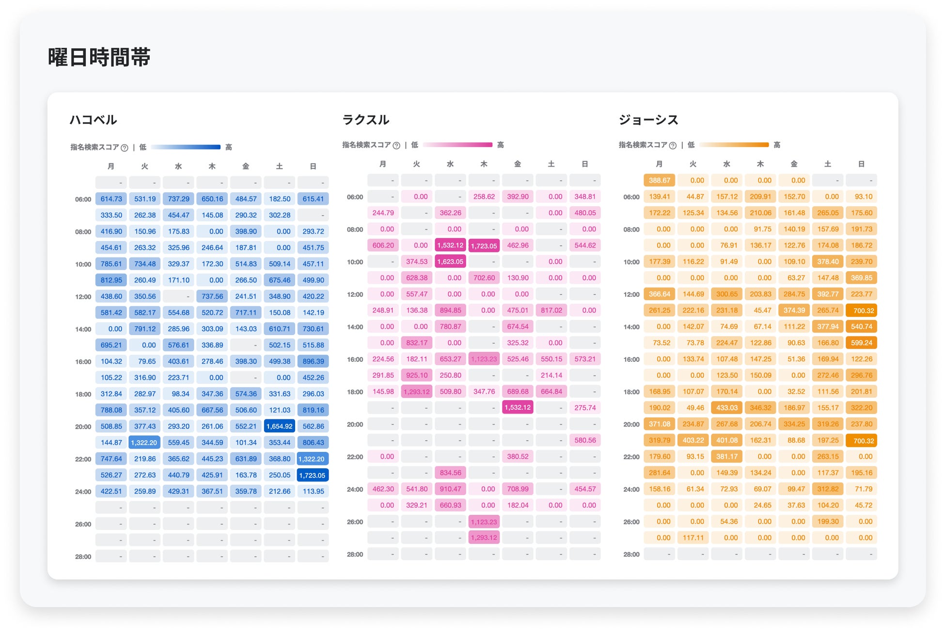 すでに特許取得済みの技術(※)で大手検索エンジンと共同で瞬間指名検索増分を計測する仕組みを開発しております。CMによる「瞬間指名検索数」、つまり “どれだけ視聴者の検索アクションに繋がったか” を評価軸としてわかりやすくUIに表示します。