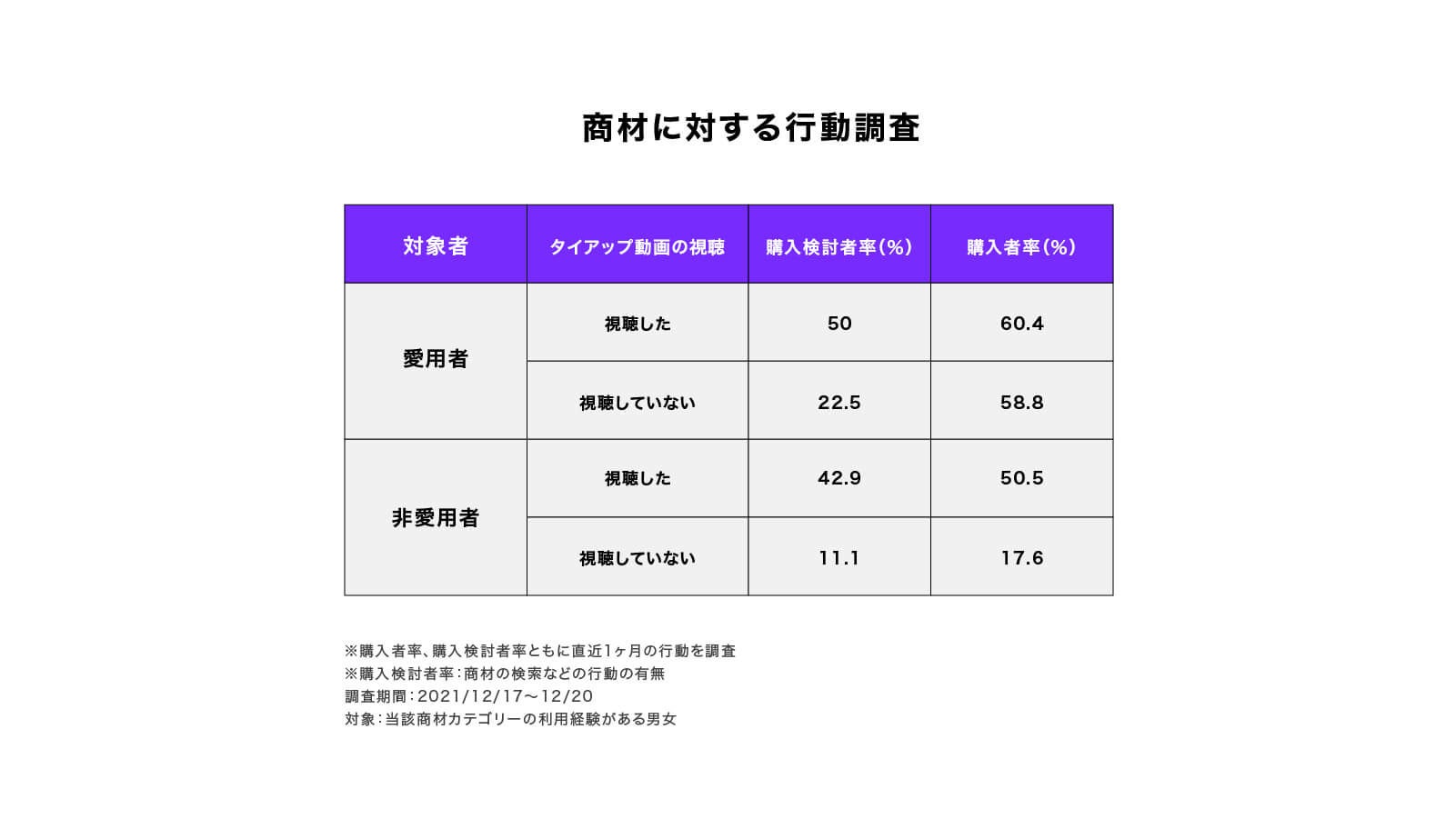 - タイアップ動画の視聴によって、商材の購入検討者率、購入者率がともに30ポイント以上アップ。