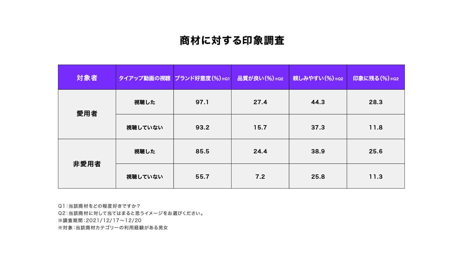 YouTubeでのタイアップ動画を視聴したか否かで、非愛用者の印象調査において以下の結果が明らかになりました。