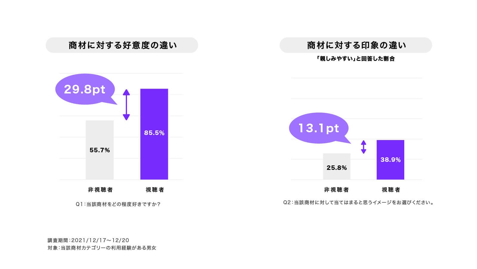 - タイアップ動画を視聴した人は、視聴していない人に比べて+29.8ポイント商材への「好意度」が高い