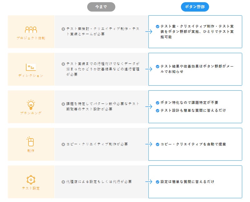 ボタン野郎は、タグ設置と改善したいCTAボタンと成果ページ等の簡単な質問に答えるだけで、統計的に最適なABテストパターンの提案、ABテスト期間のシミュレーション、ABテスト後の最適化までを自動的に実施できます。