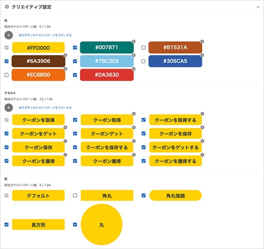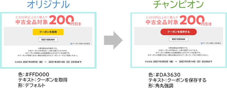 クーポン取得のCTAボタンに対して、色(5パターン)×テキスト(12パターン)×形(4パターン)の合計240通りの組合わせをABテストした結果、チャンピオンボタンのCVRがオリジナルボタンのCVRと比べて10%超改善しました。