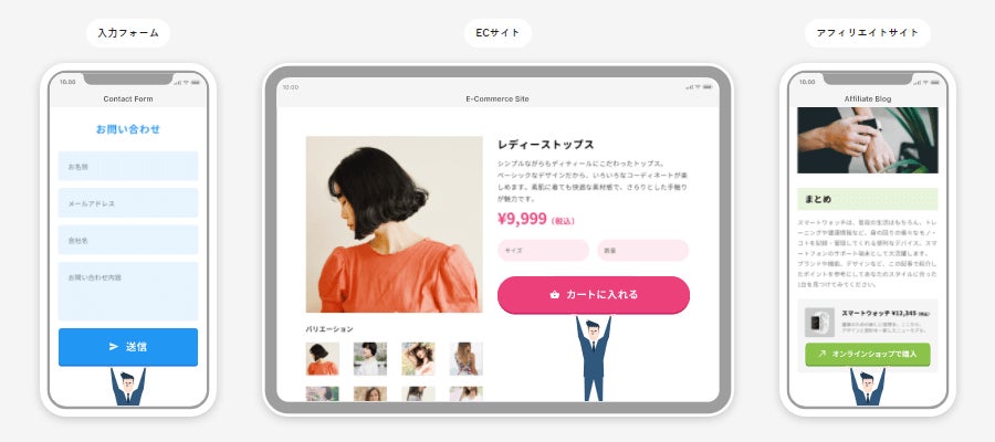 ボタン野郎は、静的なランディングページはもちろんのこと、商品ページやカートページ、入力フォーム等にも対応。様々なCTAボタンのCVRを自動的に改善できます。