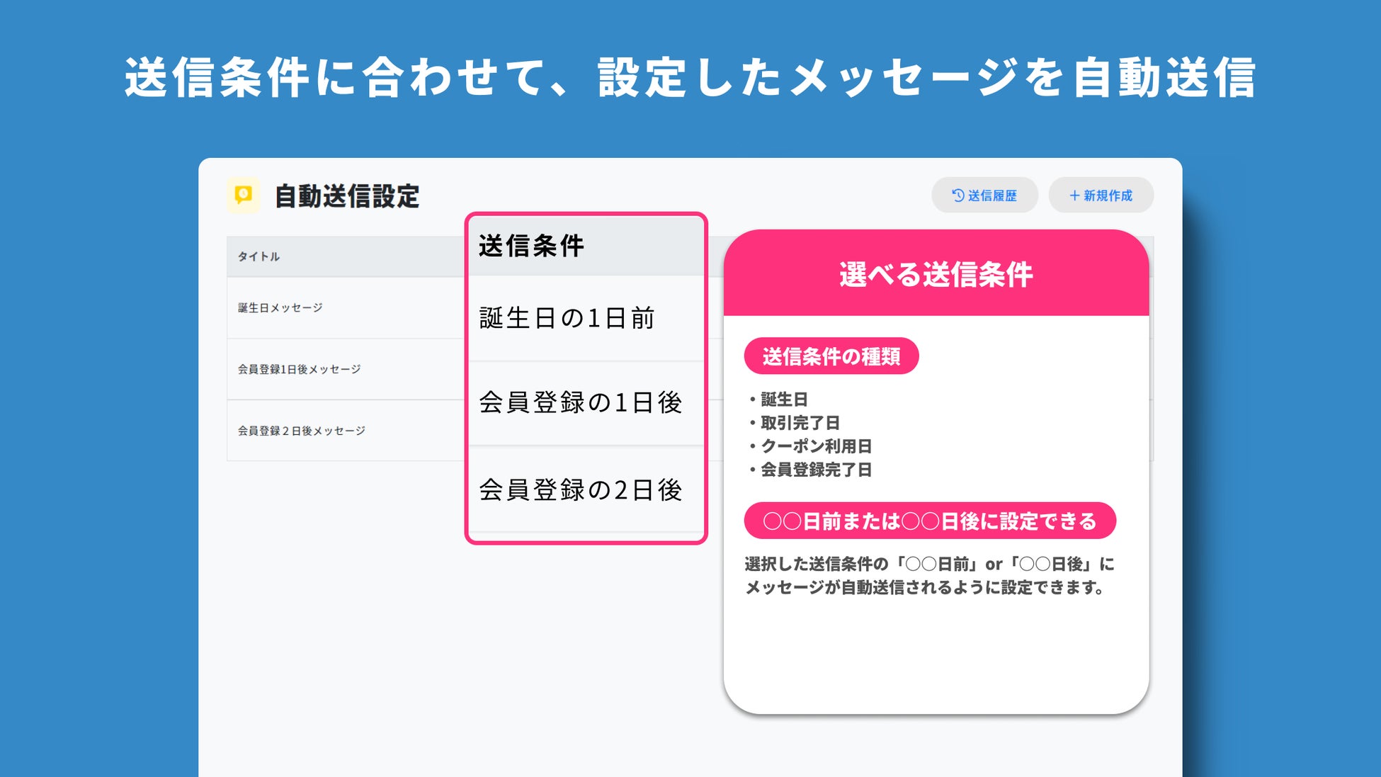 本機能では、誕生日や取引完了日などの送信条件に合わせてメッセージを自動送信することができます。送信条件として設定できるのは「誕生日」「取引完了日」「クーポン利用日」「会員登録完了日」です。