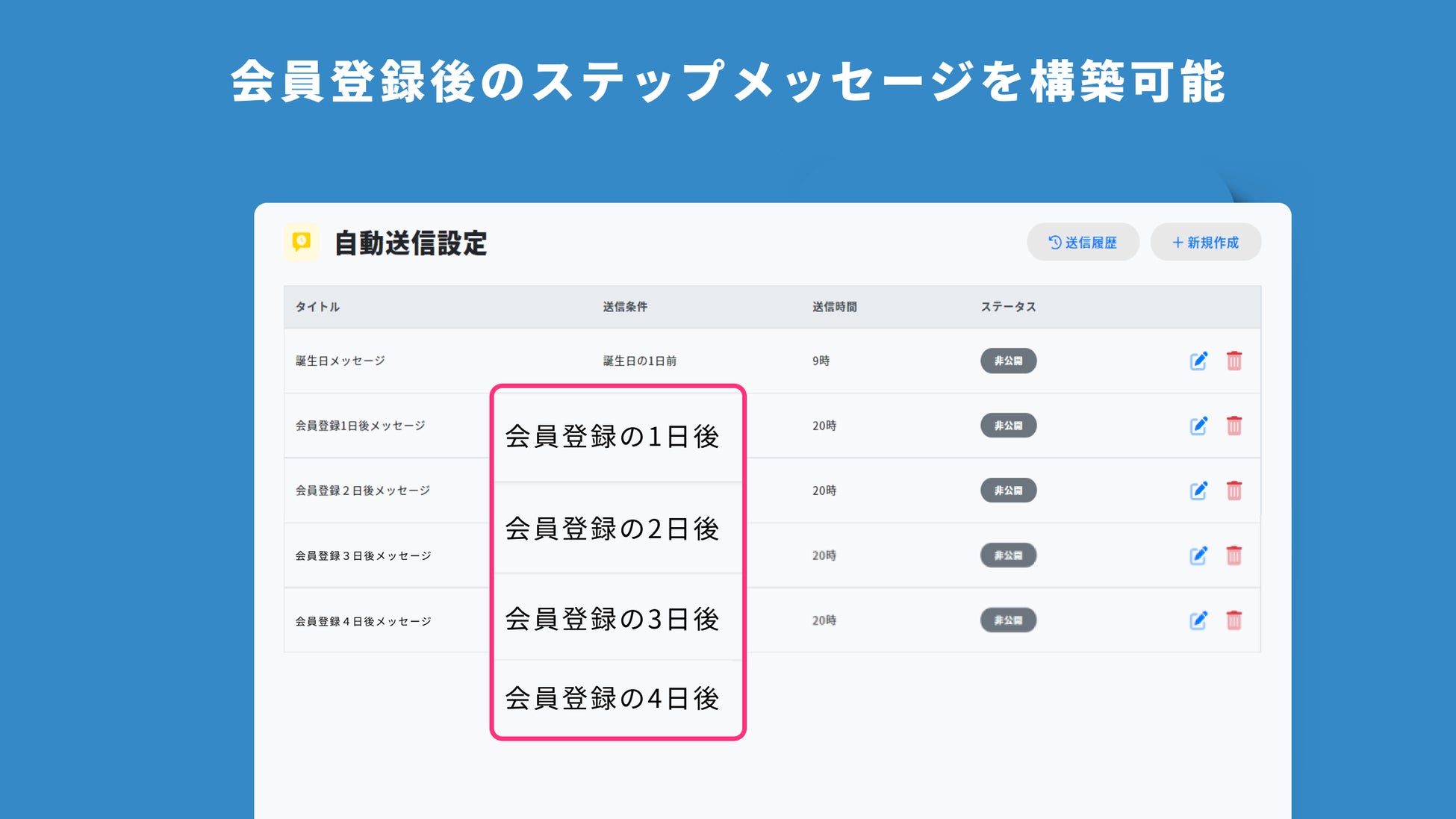 本機能では、会員登録後のステップメッセージを構築することが可能です。メールよりも開封率と到達率が高いLINE公式アカウントからステップメッセージを送信することで、配信の負担を楽にできるうえ、クリック率を高めることにも繋がります。