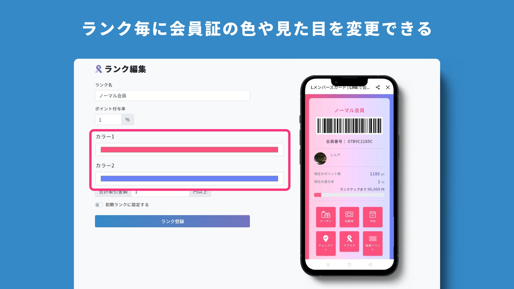 本機能では、ランク毎に会員証の色や見た目を変更できます。カラー1とカラー2をそれぞれ異なる色に設定することで、グラデーションデザインを作成することが可能です。