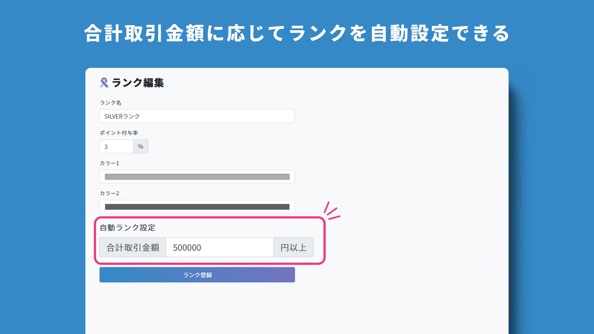 本機能では、お客様の合計取引金額に応じてランクを自動設定することができます。「あと○○円購入でランクアップ」という利用・購入の動機付けを行うことで、利用機会を増やすことが可能になります。会員ランクの存在が客単価の増加に繋がります。