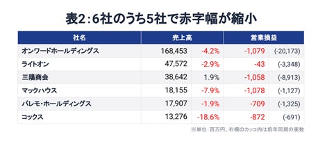 また、前年に赤字だった7社のうちTSIホールディングスは黒字転換した。他の6社を見ても、大幅減収だったコックスを除く5社が赤字幅を縮小させた(表2=表1から抜粋)。