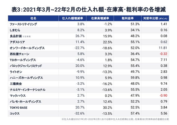 表3は各社の仕入れ額増減率と2月末の在庫高増減率、粗利益率とその昨対比をまとめたものだ。