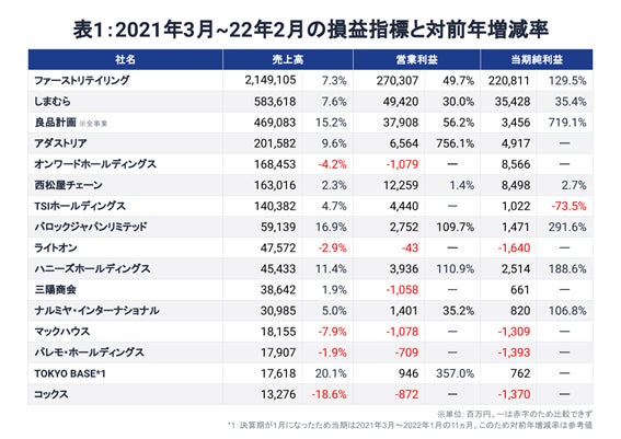 本稿の調査対象は2月期・5月期・8月期決算の主要アパレル企業16社の2021年3月~2022年2月における決算となる。決算短信を基に売上高、営業損益、当期純損益をまとめたのが表1だ。