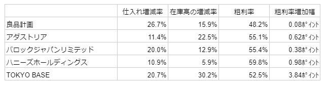 仕入れを抑制していた2021年2月期から一転して仕入れを2桁パーセントの割合で増やしており、期末在庫高も5.9%~30.2%増やした。蛇足だが、期中仕入れを増やしていても粗利率は上昇している。これは、期末在庫が増えていて、売上原価が減ったためだ。