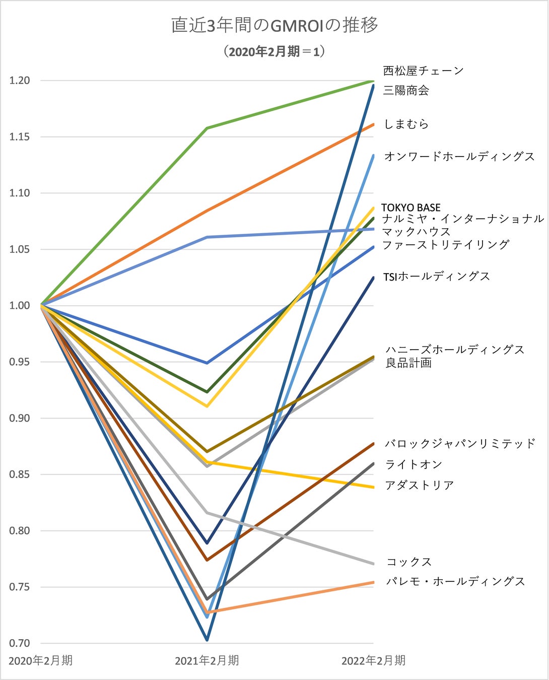 グラフに話を戻すと、アダストリアとコックス以外の14社は2022年2月期にGMROIが前期よりも改善している。中でも西松屋チェーン、三陽商会、しまむら、オンワードホールディングス、TOKYO BASE、ナルミヤ・インターナショナル、マックハウス、ファーストリテイリング、TSIホールディングスの9社はコロナ禍前の2020年2月期を上回っている。