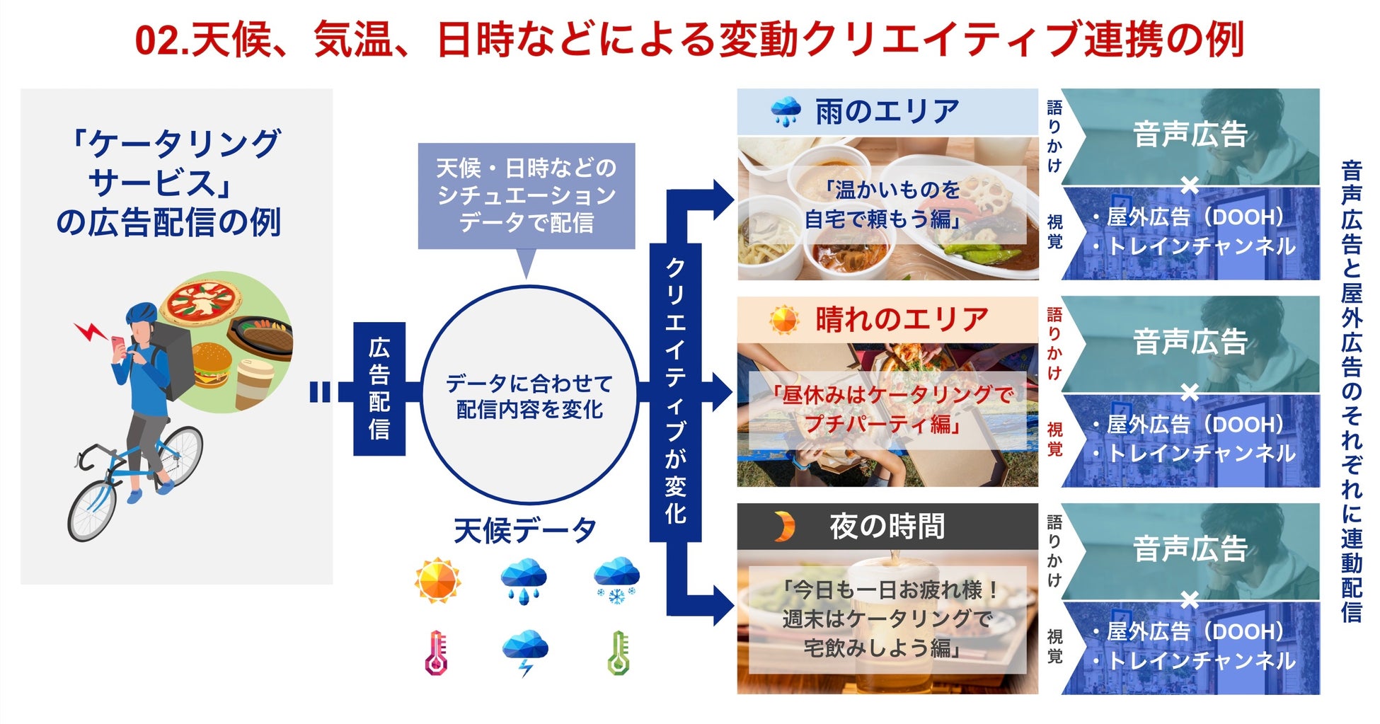 - 【デジタル音声広告】 あわせて天候データを活用し音声メディア上で天気に合わせた音声広告配信を行うことで、利用者に注文してもらう確率を向上。