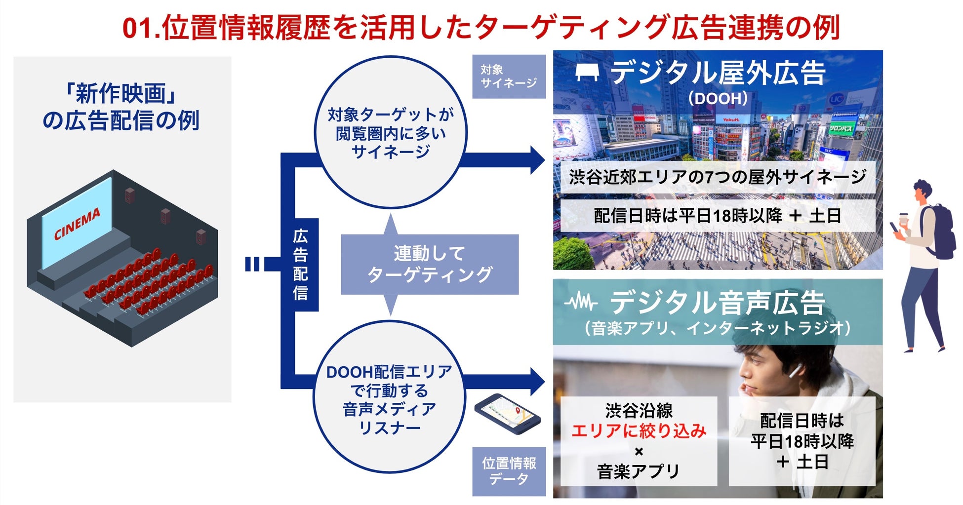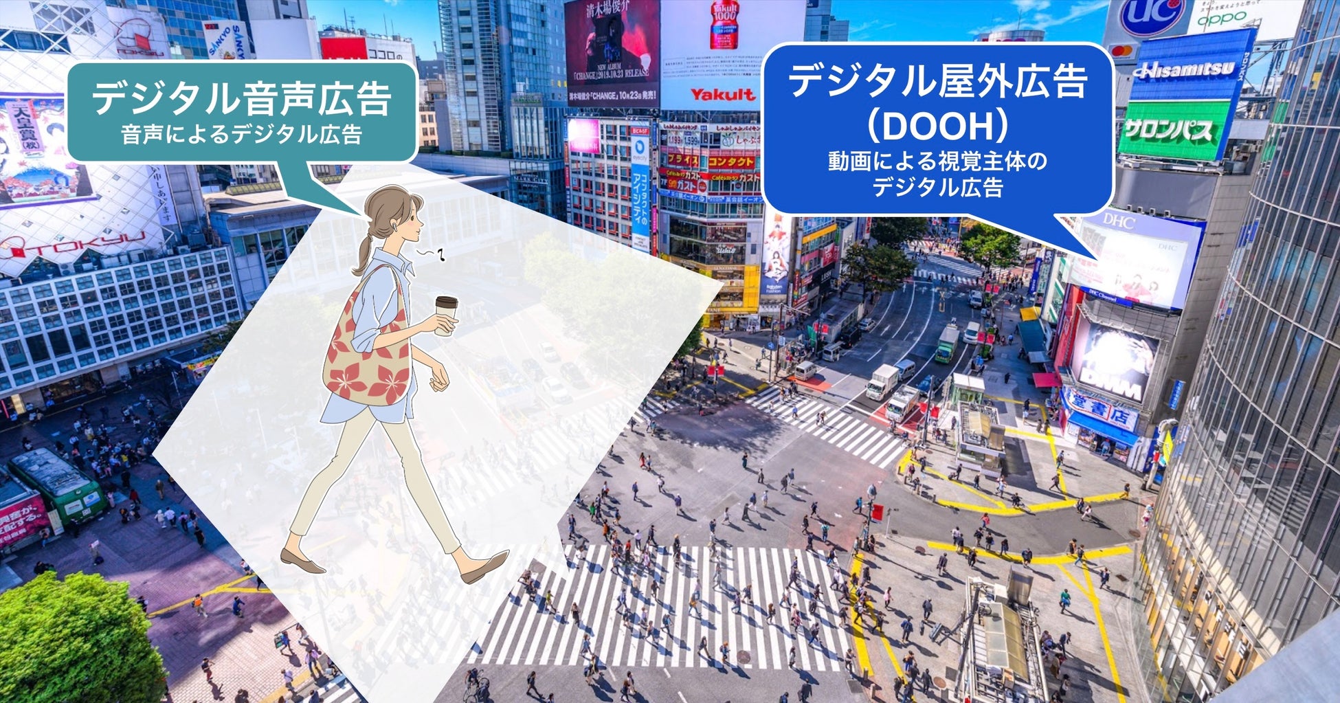 本ソリューションでは、外出先の広告訴求に強い「屋外広告(DOOH)」と「音声広告」の2つの広告フォーマットをデータ連携させることで、ターゲット顧客に対する企業のプロモーション効果の最大化を支援します。