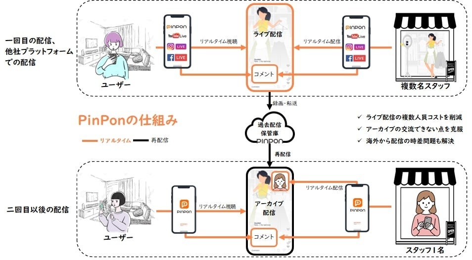 PinPon株式会社(東京都渋谷区、代表取締役:藤堂夏輝、以下)は自社ライブコマースアプリ「PinPon」内で、ライブ配信済みの映像データを再活用し、配信者と視聴者がリアルタイム交流できるライブ配信機能を追加しました。本機能のリリースを記念し、他社プラットフォームでライブ配信済み映像コンテンツの再利用するサステナブルチャレンジ先行体験を5月1日から先着30名限定で無償提供します。
