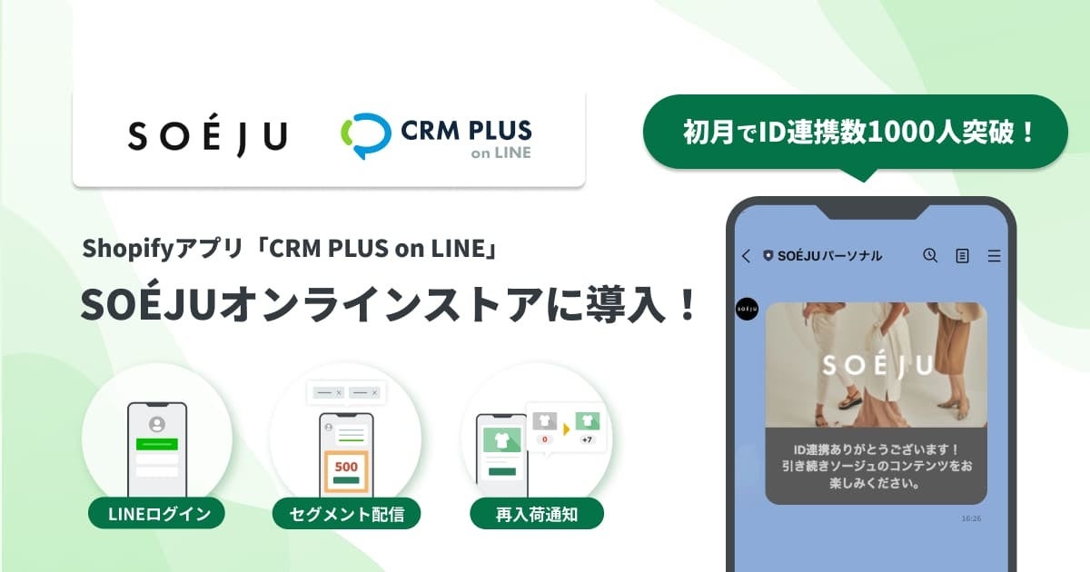 2022年5月11日、Shopify(ショッピファイ)アプリ「CRM PLUS on LINE」(株式会社ソーシャルPLUS、所在地:東京都文京区、代表取締役:岡田 風早)を、モデラート株式会社が運営する「SOÉJU(ソージュ)オンラインストア」に導入いただきました。