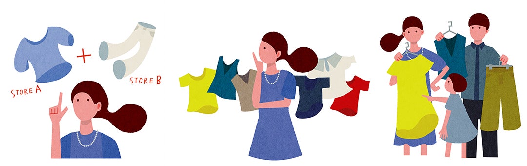 E SALONをご利用いただくことで、違うブランドの商品を組み合わせてコーディネートができ、広いフィッテングルームでは、家族や友人とご一緒に試着が可能となり、色々なブランドのアイテムを着比べられることが可能となります。