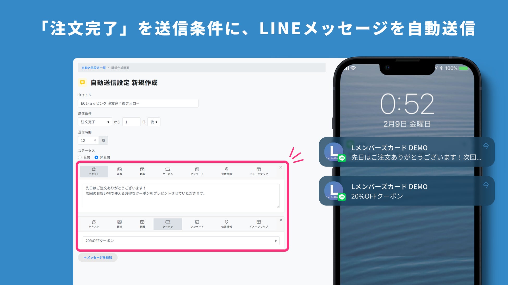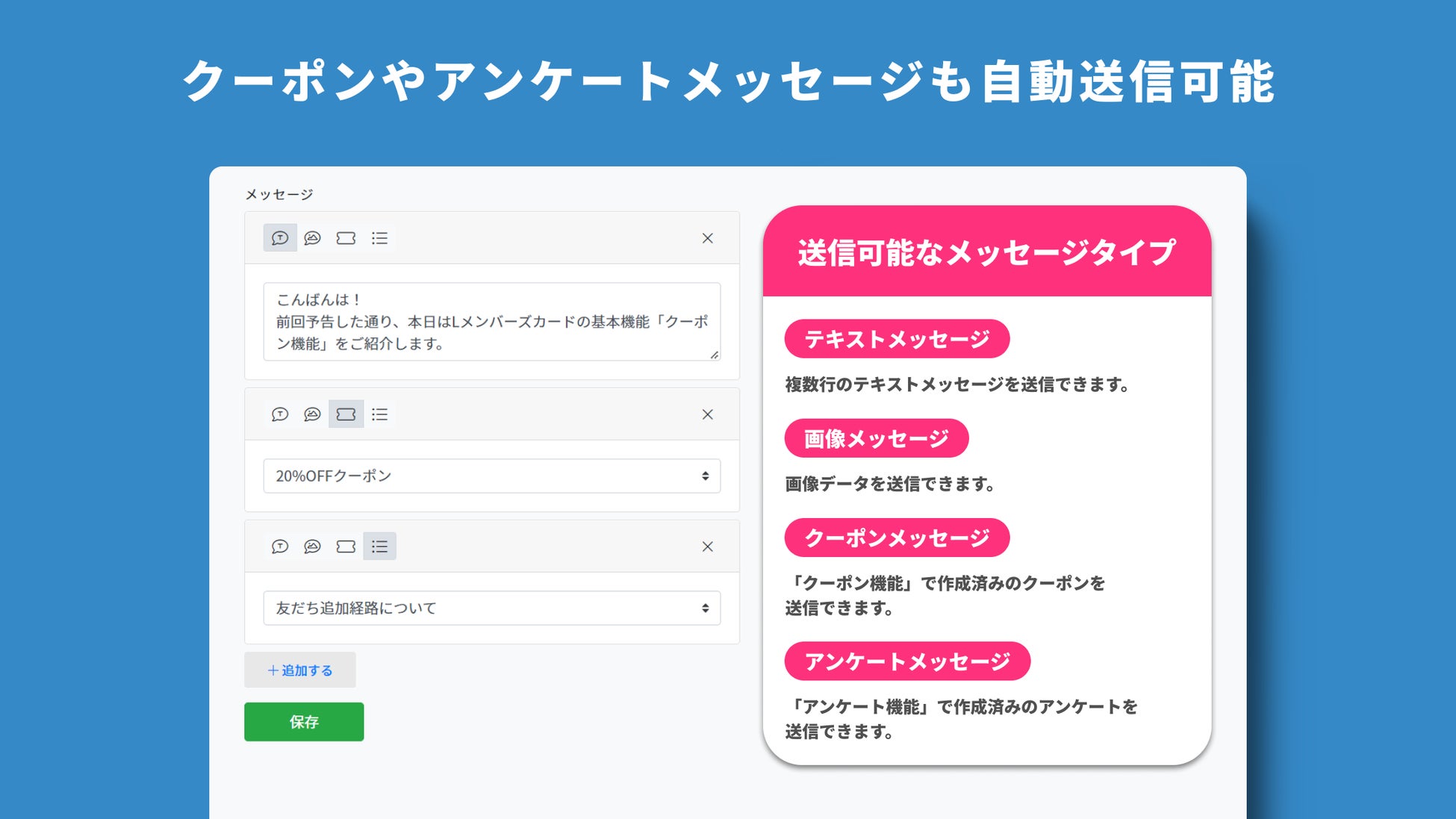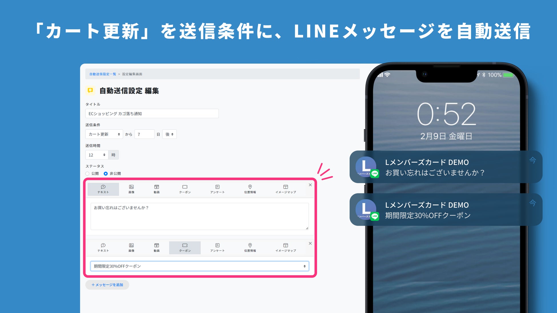 自動メッセージ送信機能では、様々なメッセージタイプに対応しています。ECショッピング機能から商品を購入したユーザーや、カートに商品を追加したまま離脱してしまったユーザーに対して、テキストメッセージだけでなく限定クーポンを送ることで、より一層高い購買促進を行うことも可能になります。