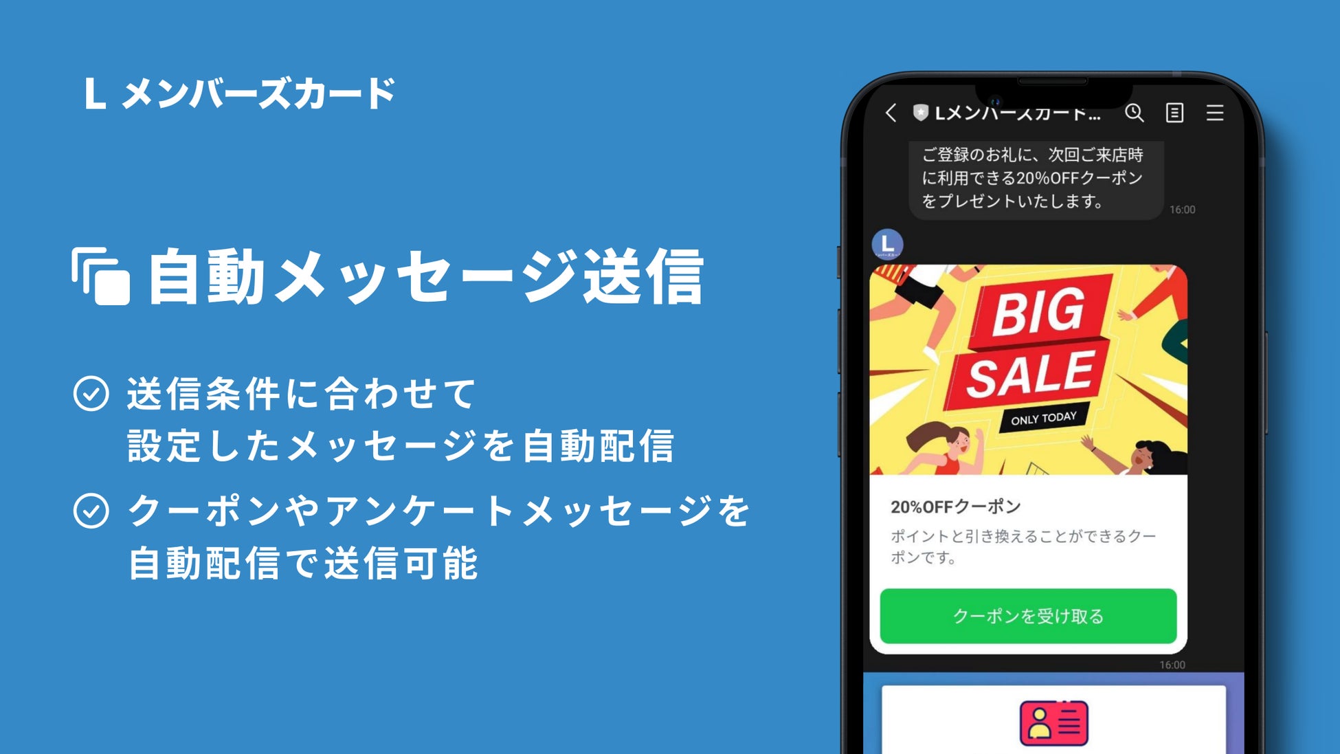 Lメンバーズカードの基本機能として利用いただける「自動メッセージ送信機能」では、LINEメッセージの自動化・効率化が実現します。具体的には、以下のことができるようになります。