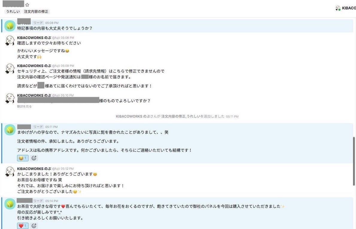 問い合わせをしてくるお客様の大半が購入前です。購入前にお客様が納得されるまで説明できるので毎回丁寧な対応だと感謝されますし、購入につながる接客ができています。例えばKIBACOWORKSで一番売れている名入れキータグは、完成イメージを画像にしてチャットで送っています。画像だとパッとイメージがわくので購入につながりやすいです。購入方法が分からないというお客様にもスクショを送って対応していますが、画像を送るのも簡単なのでまったく苦にならないと仰って頂いています。