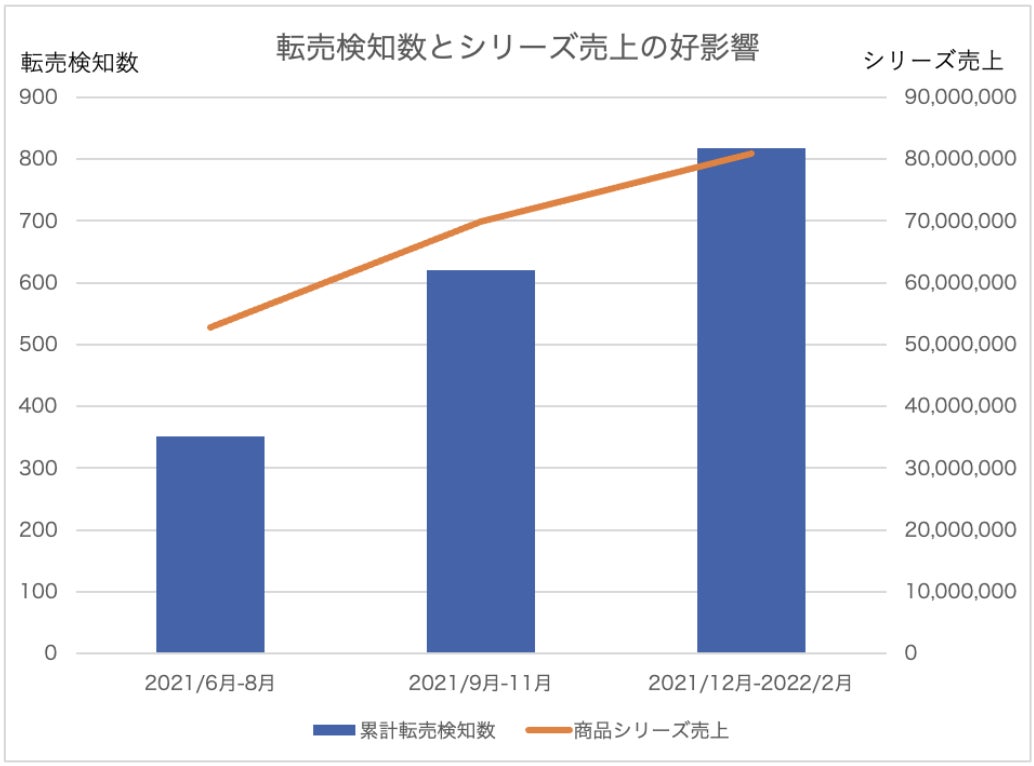 この度の転売検知システムの導入により800件以上の転売を防止、ブランド毀損を阻止することでECモールにおいてはもちろん、実店舗の販売への好影響が確認されました。