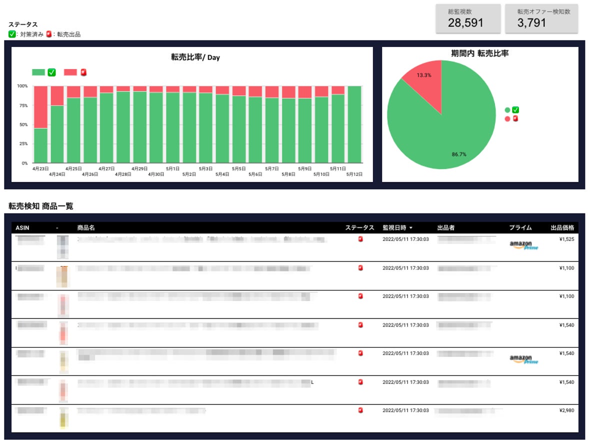 ※しるし社で活用されている転売検知および防止ダッシュボードの一部