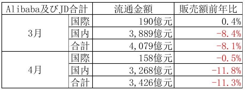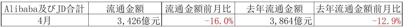 まず、主要モール全体(JD、天猫(中国国内及び国際)、淘宝網(中国国内及び国際)の4月の流通金額は3,426億元(日本円:約6.8兆円)で、3月と比べ16.0%の減少でした。3月には「女神節」(3月8日国際婦人の日)という大型のECキャンペーンがあり、例年4月は3月に比べて減少する傾向があり、2021年も12.9%減少していましたが、今年はより顕著な減少となっています。