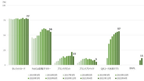 QRコード決済の利用率が、全体で57%となり、FeliCa型電子マネーを初めて上回る結果となりました。2021年12月から利用率を調査しているBNPLは、既にブランドプリペイドを凌ぐ勢いとなっており、11%の利用率でした。個別サービスの利用率推移では、楽天カード・PayPayの利用が引き続き拡大しており、株式会社ネットプロテクションズの後払いサービスである「NP後払い」も6%と躍進しました。