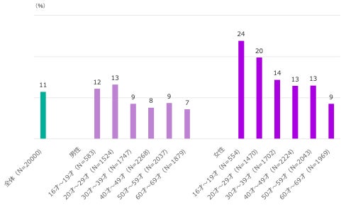 ■  BNPLの利用は若年層の女性が多く、年齢でみると16〜19才が最多で24%、20〜29才と続いた