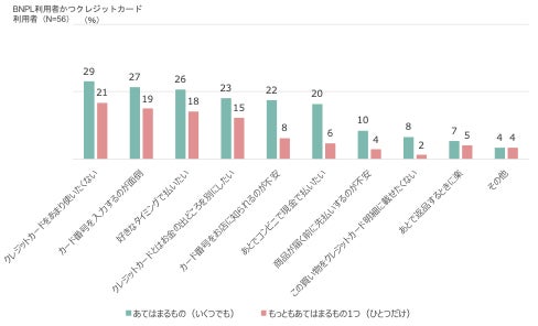 ■  クレジットカードと併用している人のBNPLの利用理由としては「クレジットカードをあまり利用したくない」という人が多く、次いで「カード番号を入力したくない」「好きなタイミングで払いたい」