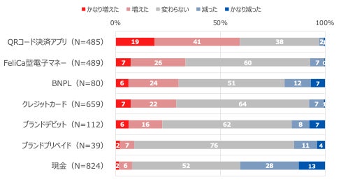 ■  現金の利用は、1年間で41%の人が減少。中でも13%の人が「かなり利用が減った」と回答
