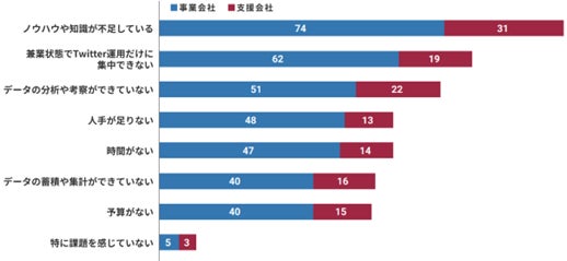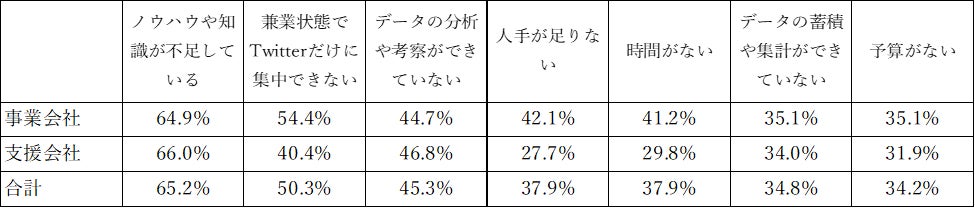 【ノウハウや知識が不⾜している】が64.9%と課題意識が最も⼤きい。次いで【兼業状態でTwitterだけに集中できない】が54.4%、【データ分析や考察ができていない】が44.7%となった。
