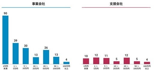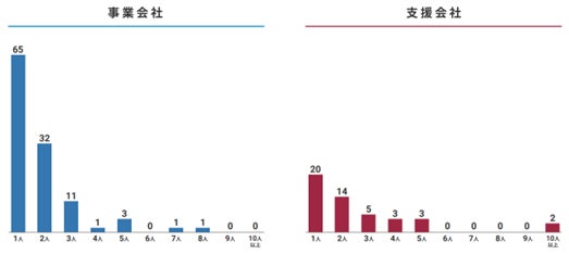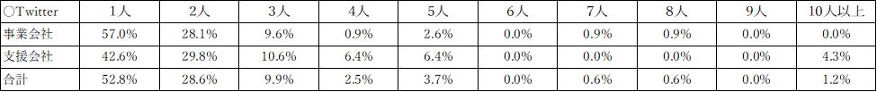 ・Twitter運⽤に関わる⼈数について、事業会社は【1〜2⼈】が全体の85.1%を占める。事業業会社と支援会社でみると【5人以上】が運営に関わっているのは、3.7%と少数の結果となった。