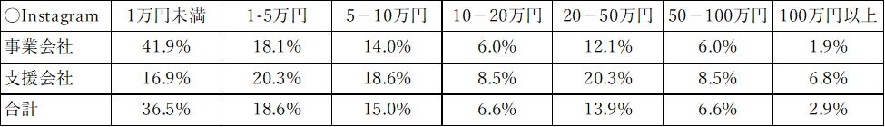 【1-10万円未満】だとInstagramは70.1%に対して、Twitterは84.4%となり、Instagramと比べるとTwitterは低予算で運用されていることが分かった。