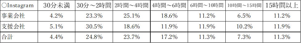 運⽤にかける1週間あたりの時間について、【30分未満~2時間】との回答は、Instagramが29.2%、