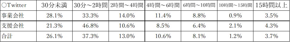 一方、事業会社の8.8%は【6時間~10時間以上】をTwitter運用にかけていると回答していることから、少数ではあるがTwitter運用に力を入れている企業もあることが分かった。