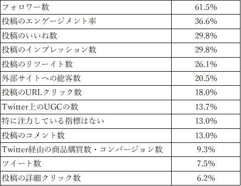 【フォロワー数】が最多の61.5%。次いで【投稿のエンゲージメント率】が36.6%、【投稿のいいね数】と【投稿のインプレッション数】が29.8%となった。