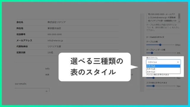 また、テーブルは3種類から選べるので、サイトのデザインにあった会社概要を作成できます。