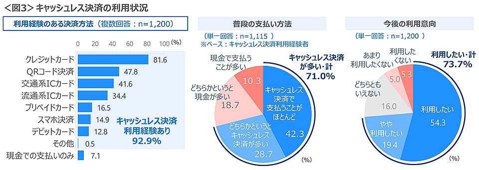 キャッシュレス決済の利用者は93%、種別は「クレジットカード」82%、「QRコード決済」48%、「交通系ICカード」42%が上位である。「QRコード決済」は日本でのサービス開始から約10年、半数近くの人が利用する決済方法となった。キャッシュレス決済の今後の利用意向「やや+利用したい」は74%であり、人々の生活に定着している様子がうかがえる。<図3>