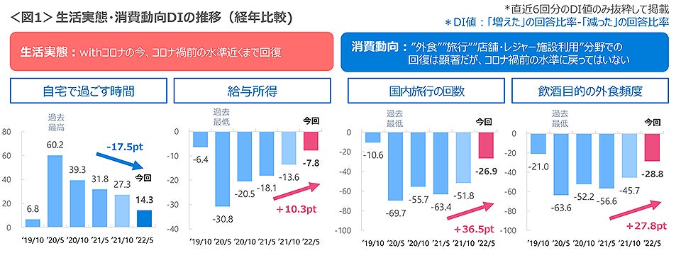 生活実態について、今回調査では「自宅で過ごす時間」が前年同期より18ptの低下、コロナ禍となり一気におうち時間が増えた2020年5月からは46ptと大幅に低下しており、低下傾向も続いている。また、「給与所得」は前年同期より10pt、2020年5月からは23ptの上昇であり、コロナ禍前の水準近くまで回復している。