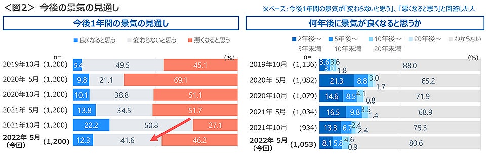 今後1年間の景気の見通しについて「悪くなると思う」と回答した人は、前回調査(2021年10月)の27%が最低値となり、今回調査は46%と19ptの増加に転じた。次いで多いのは「変わらないと思う」で42%。この半年間で光熱費やガソリン、食品の値上げラッシュが続く中、世界状況の不安要素もあり、今後の景気の見通しは「わからない」が8割を占めた。<図2>