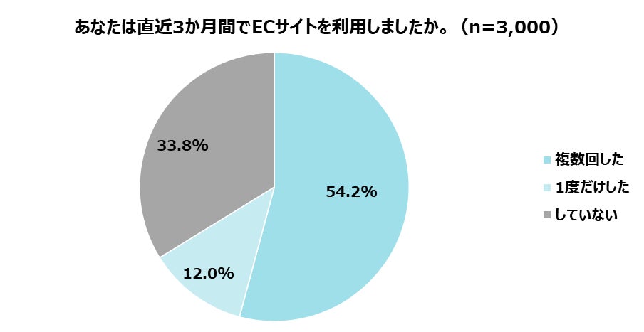 全体では「複数回利用した」が54.2%、「1度だけ利用した」が12.0%と直近3か月間でのECサイトの利用率は66.2%であることが判明しました。