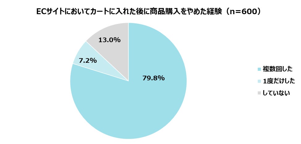 ECサイトを利用する際にカートに入れた後に商品購入をやめた経験があるかお聞きしたところ、「複数回ある」が79.8%、「1度のみある」が7.2%と合計で87.0%もの方がカートに入れた後に購入直前で取りやめた経験があることが判明しました。