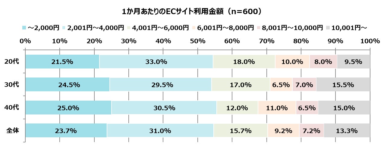 1か月のECサイトの利用金額をお聞きしたところ全体では「2,001円~4,000円」が最も多く31.0%、次いで「~2,000円」が23.7%と半数以上の方が4,000円以内の利用であることがわかりました。