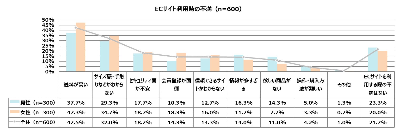 全体では「送料が高い」が42.5%と最も多く次いで「サイズ感・手触りなどがわからない」が32.0%となった。「不満がない」と答えた方は21.7%にとどまり、全体の約8割の方が不満を抱えながらECサイトを利用している。